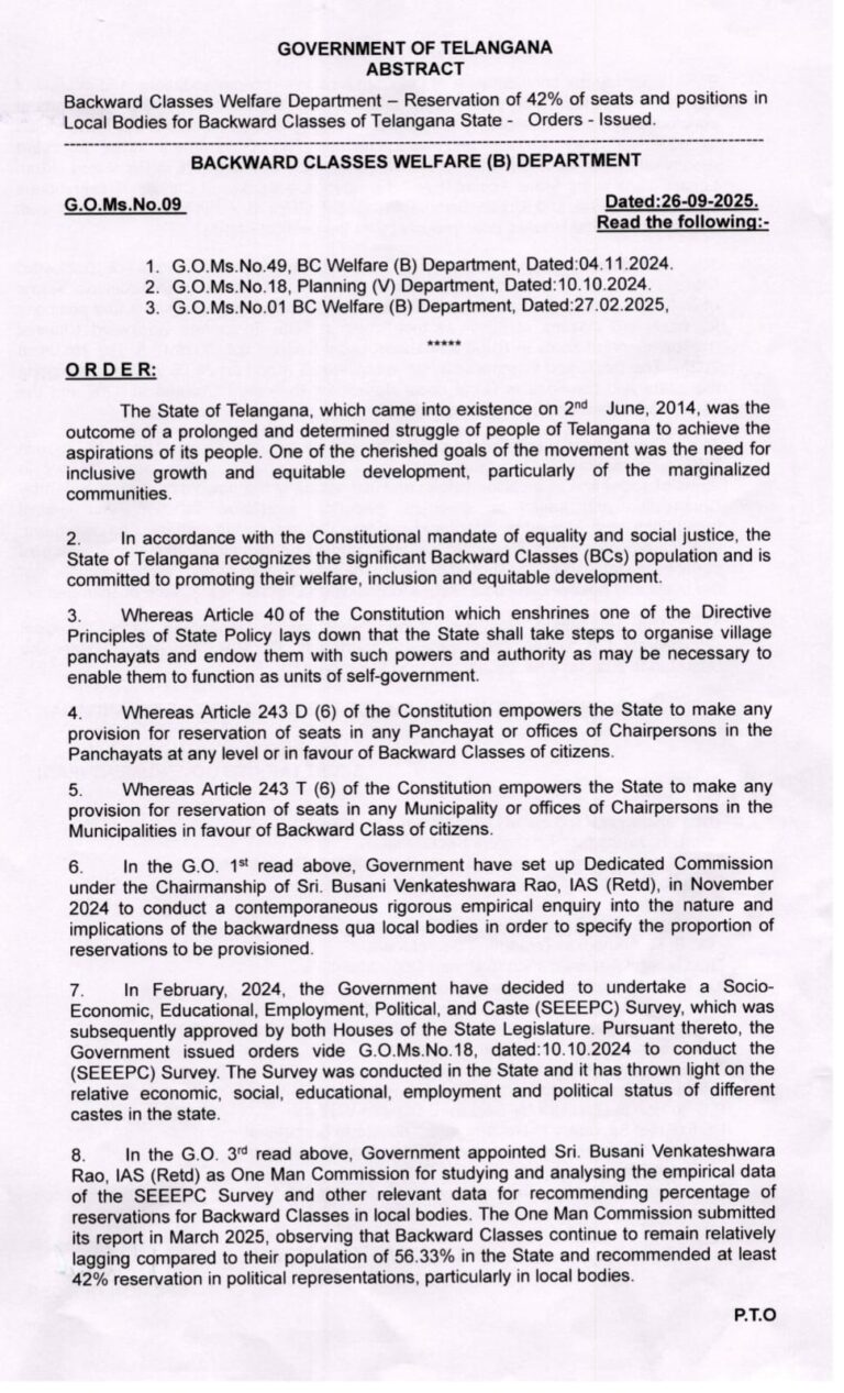 స్థానిక సంస్థ ఎన్నికల్లో బీసీలకు 42 శాతం రిజర్వేషన్లు కల్పిస్తు తెలంగాణ ప్రభుత్వం జీవో జారీ చేసింది. గతంలో ప్రభుత్వం ఆమోదించిన బిల్లును కేంద్రం పెండింగ్ లో...