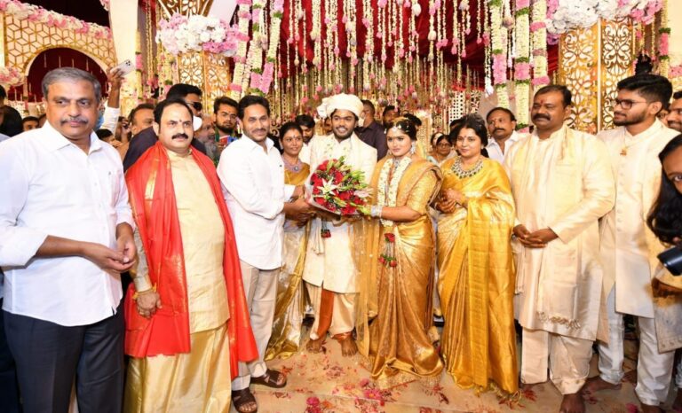 నంద్యాల జిల్లా బనగానపల్లె ఎమ్మెల్యే కాటసాని రామిరెడ్డి కుమారుడి వివాహా వేడుకకు ఎపి ముఖ్యమంత్రి వైఎస్ జగన్ హాజరయ్యారు. వరుడు శివ,వధువు మేధాశ్రీ రెడ్డిలను ఆయన ఆశ్వీరధించారు....