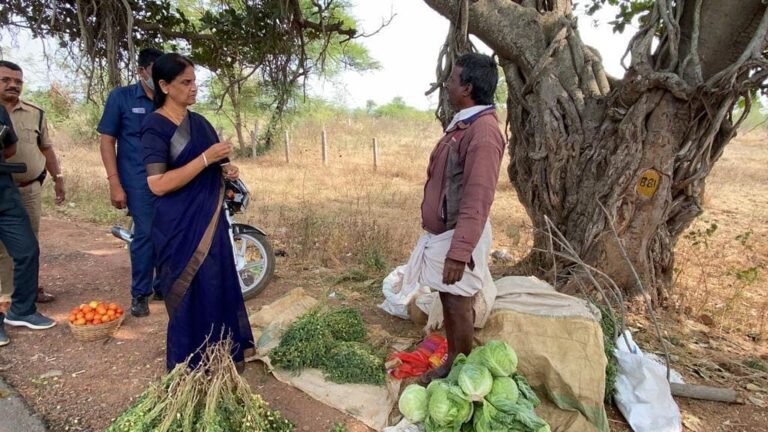 మంత్రి సబితా ఇంద్రారెడ్డి రోడ్డు పక్క కూరగాయలు అమ్మే రైతు యోగక్షేమాలు కనుక్కున్నారు. రైతు దగ్గర శనిగలు, క్యాబేజీ కొనుగోలు చేశారు. అమ్మకాలు ఎలా ఉన్నాయని రైతుతో...